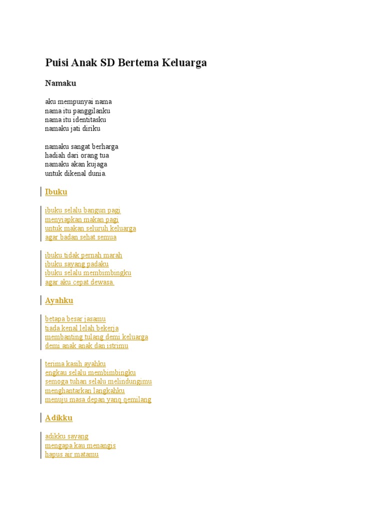 Dan bila kita kini telah dewasa maka selayaknya kita berbakti dan mengabdi demi membalas apa yang telah beliau korbankan. Salah satunya adalah puisi bertema keluarga. Ada banyak puisi anak di halaman ini puisi puisi tersebut dipilah dalam beberapa tema ada puisi anak tentang alam keluarga kesehatan binatang ada puisi anak dengan tema budi pekerti dan permainan ada juga kumpulan puisi dengan berbagai tema lainnya.