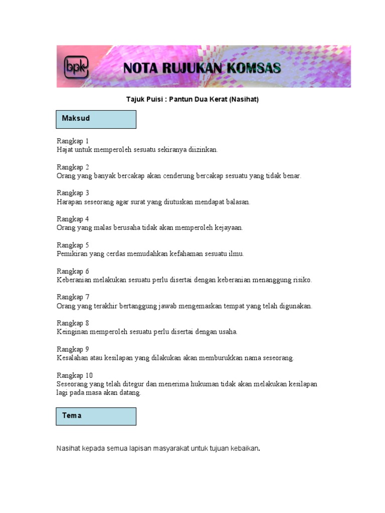 Nota Bestari Komsas Unit 1 Puisi Tradisional 1 Pantun Dua